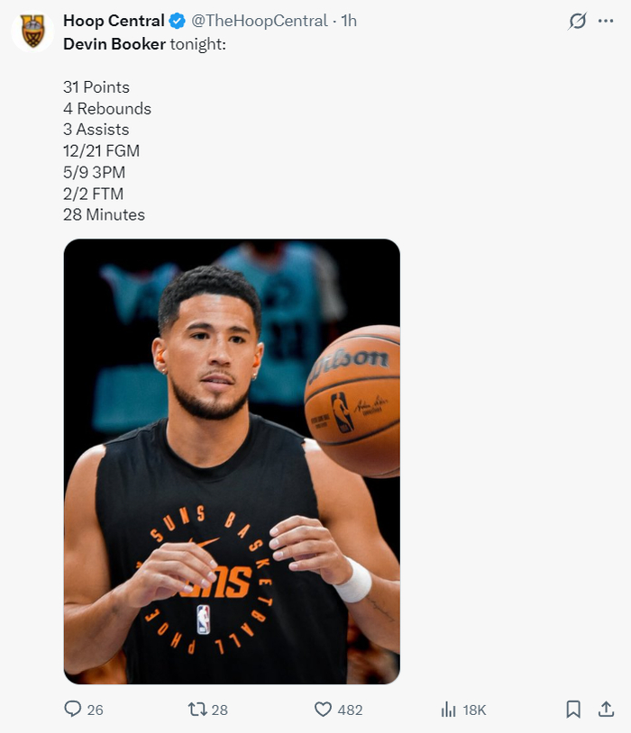 布克短短28分钟,21中12,三分9中5,拿到31分4篮板3助攻,格林的伤退对太阳的打击远不及布克,因为布克是这支太阳的第一核心。