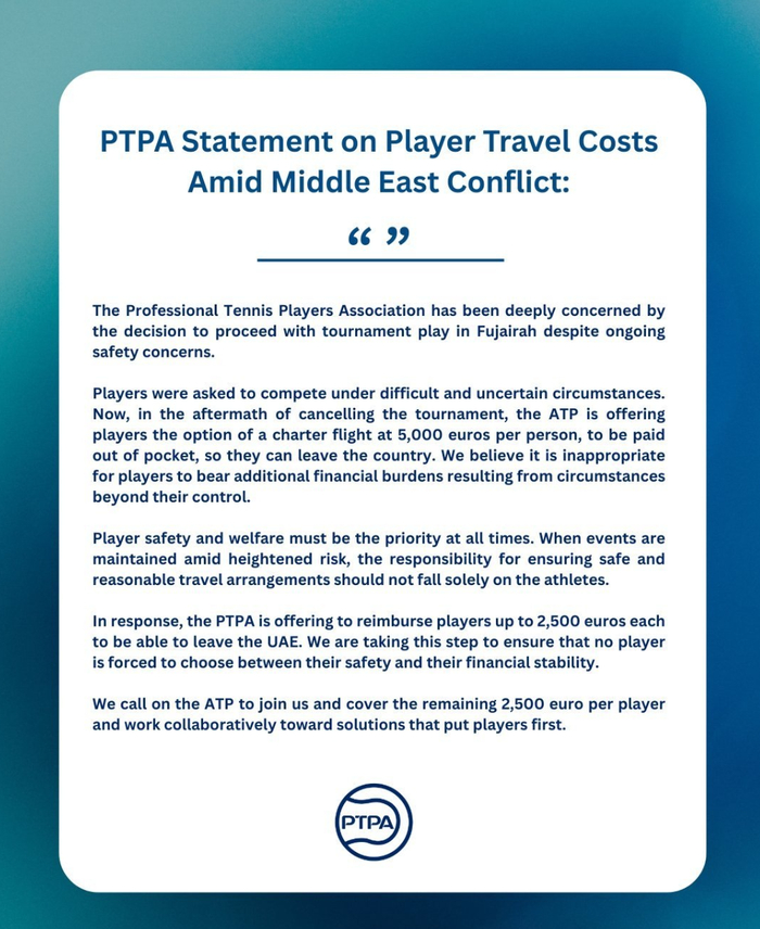 PTPA在对这件事发声时强调,“强烈反对让球员承担超出自身控制的额外经济负担。”对外展示的态度相当明确,认为这笔费用由球员个人承担不合理,同时给出了他们的解决方案,PTPA承担其中的2500欧元,剩余的部分由ATP负责。
